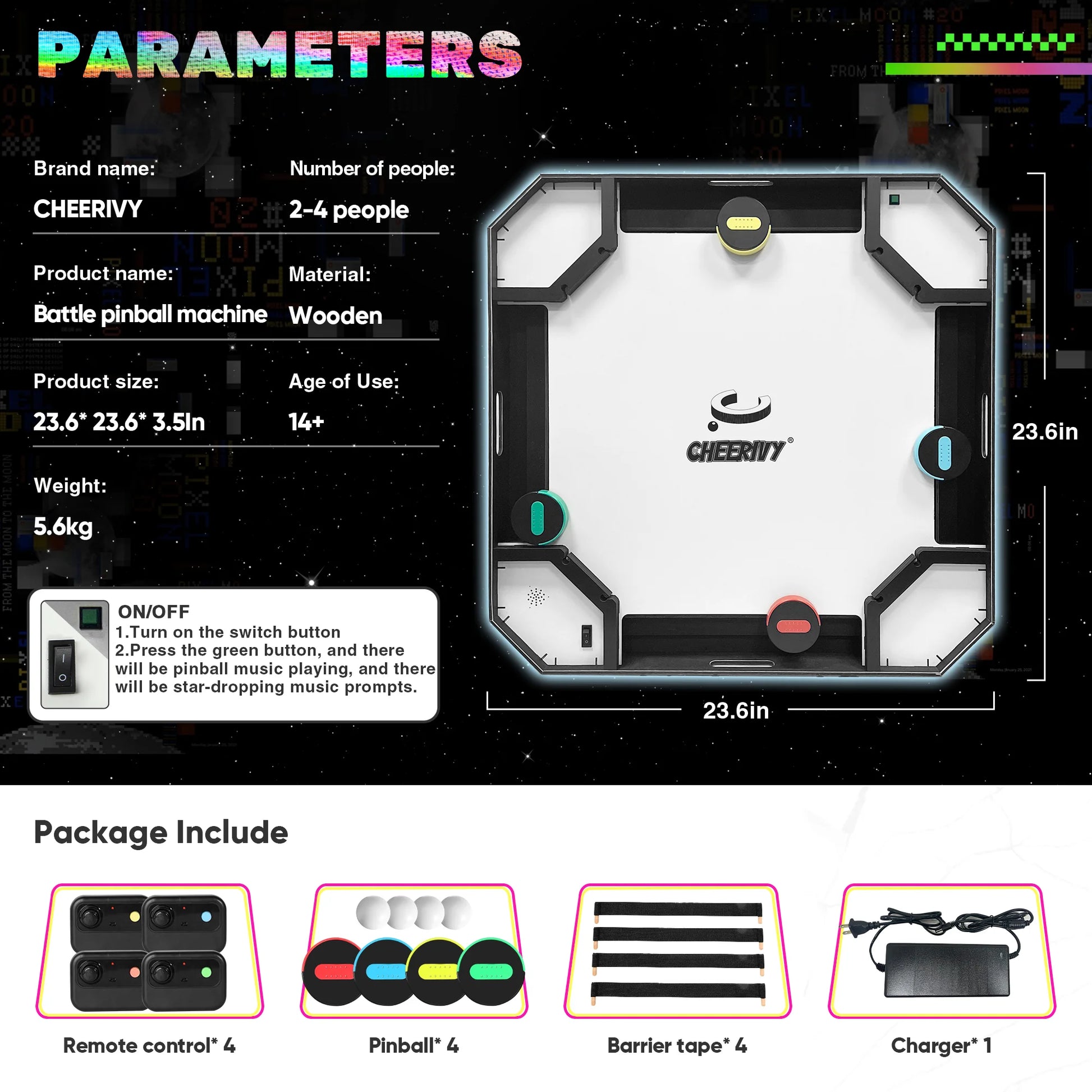جهاز تحكم عن بعد × 4، كرات بينبول × 4، شريط حاجز × 4، شاحن × 1