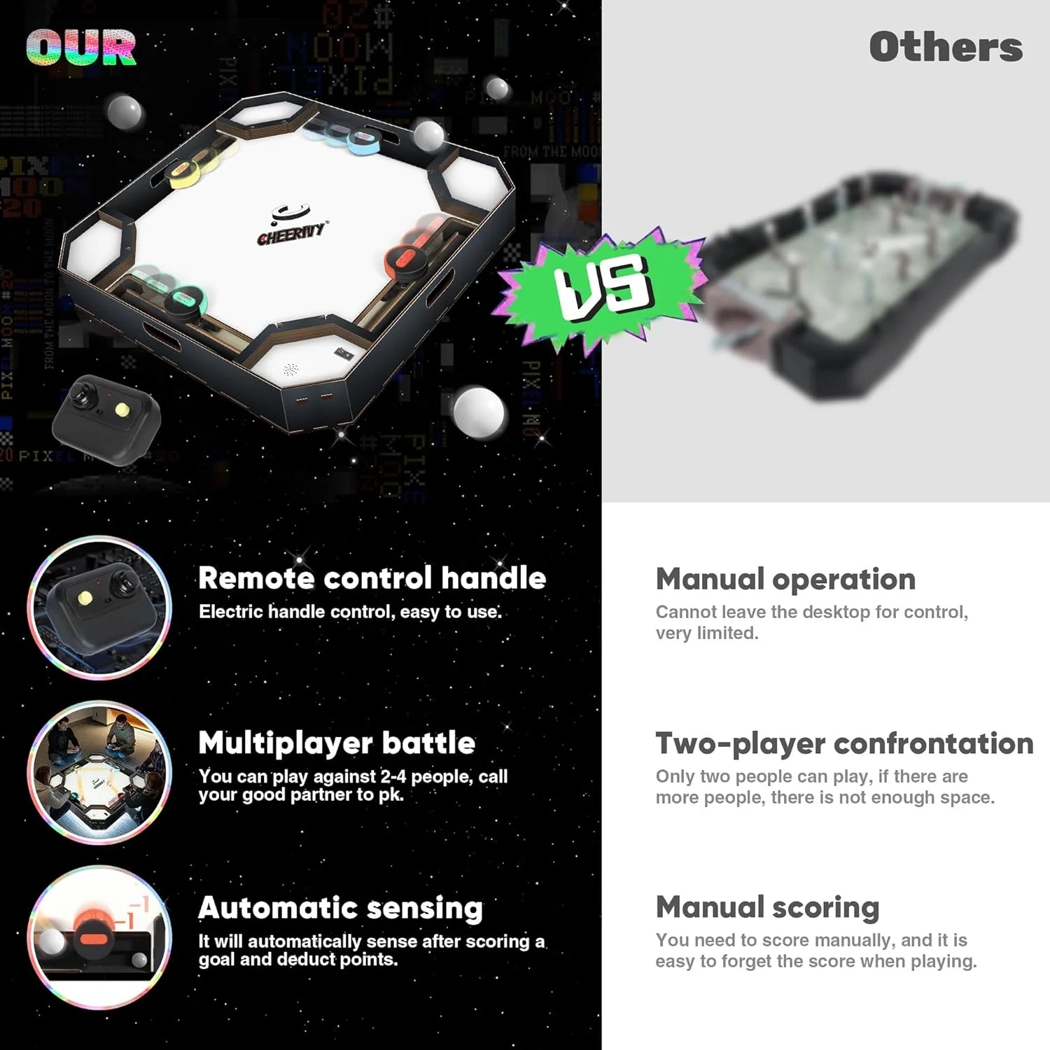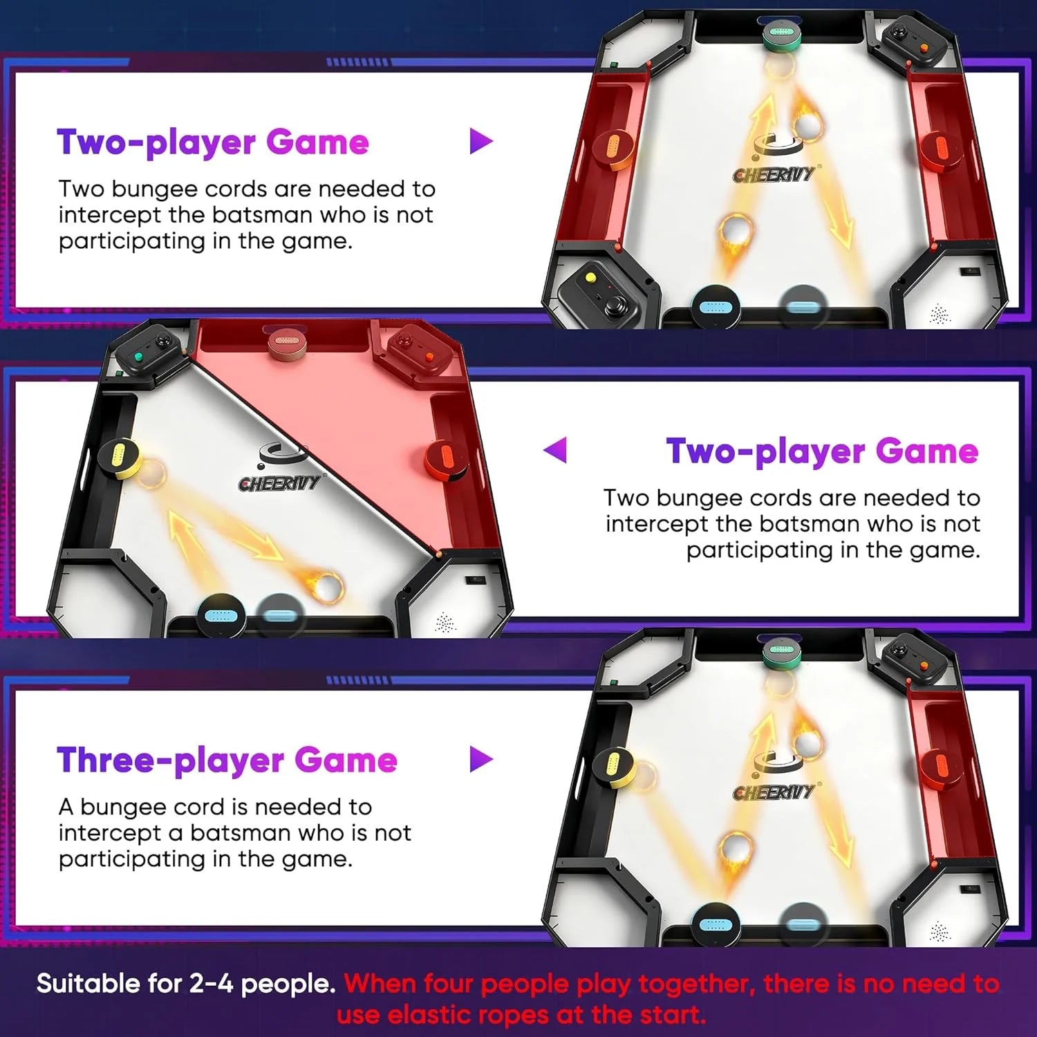 لعبة Cheerivy© Initial هي لعبة متعددة الاستخدامات يمكن الاستمتاع بها مع لاعبين أو ثلاثة أو أربعة لاعبين، مما يجعلها مثالية للتجمعات الصغيرة والمجموعات الكبيرة على حد سواء. يُزوّد كل لاعب بوحدة تحكم مصممة بعناية. تتكون وحدة التحكم هذه بذكاء من عصا تحكم سريعة الاستجابة تتيح تحكمًا دقيقًا، وزر ضغط مريح يوفر نقرة مميزة مع كل ضغطة، وشاشة عرض واضحة مكونة من 10 مصابيح LED تُظهر النتيجة بوضوح، ليتمكن اللاعبون من متابعة تقدمهم في اللعبة بسهولة.