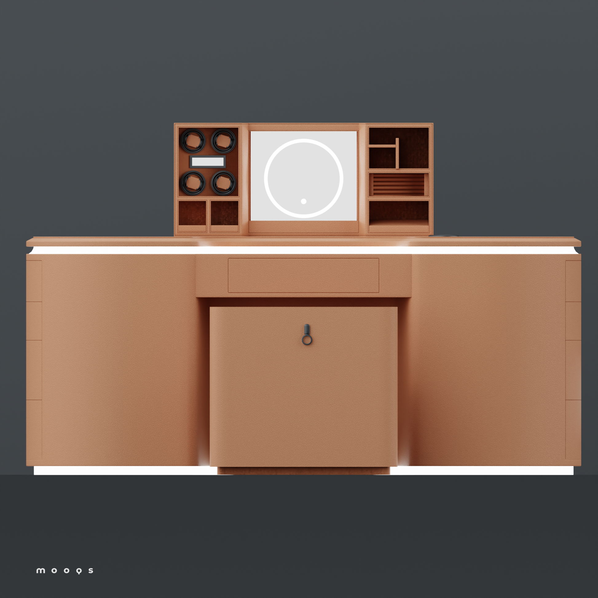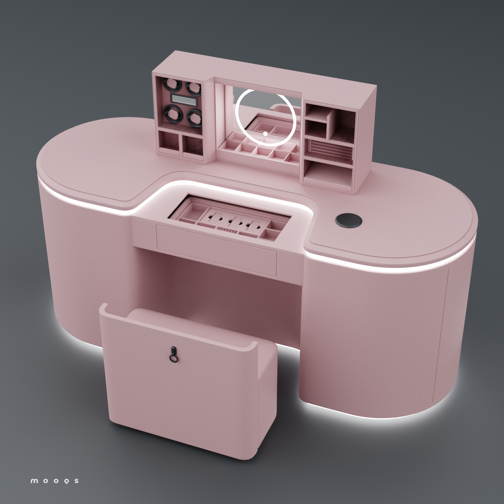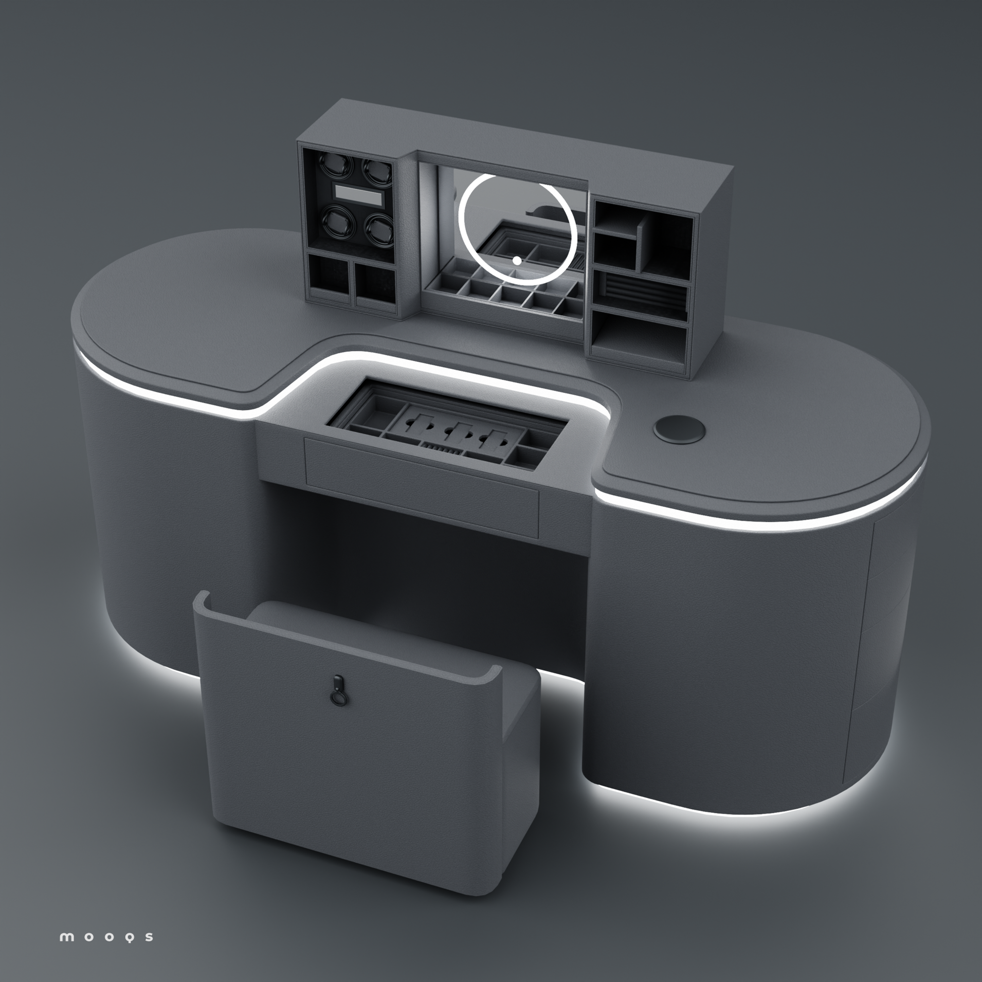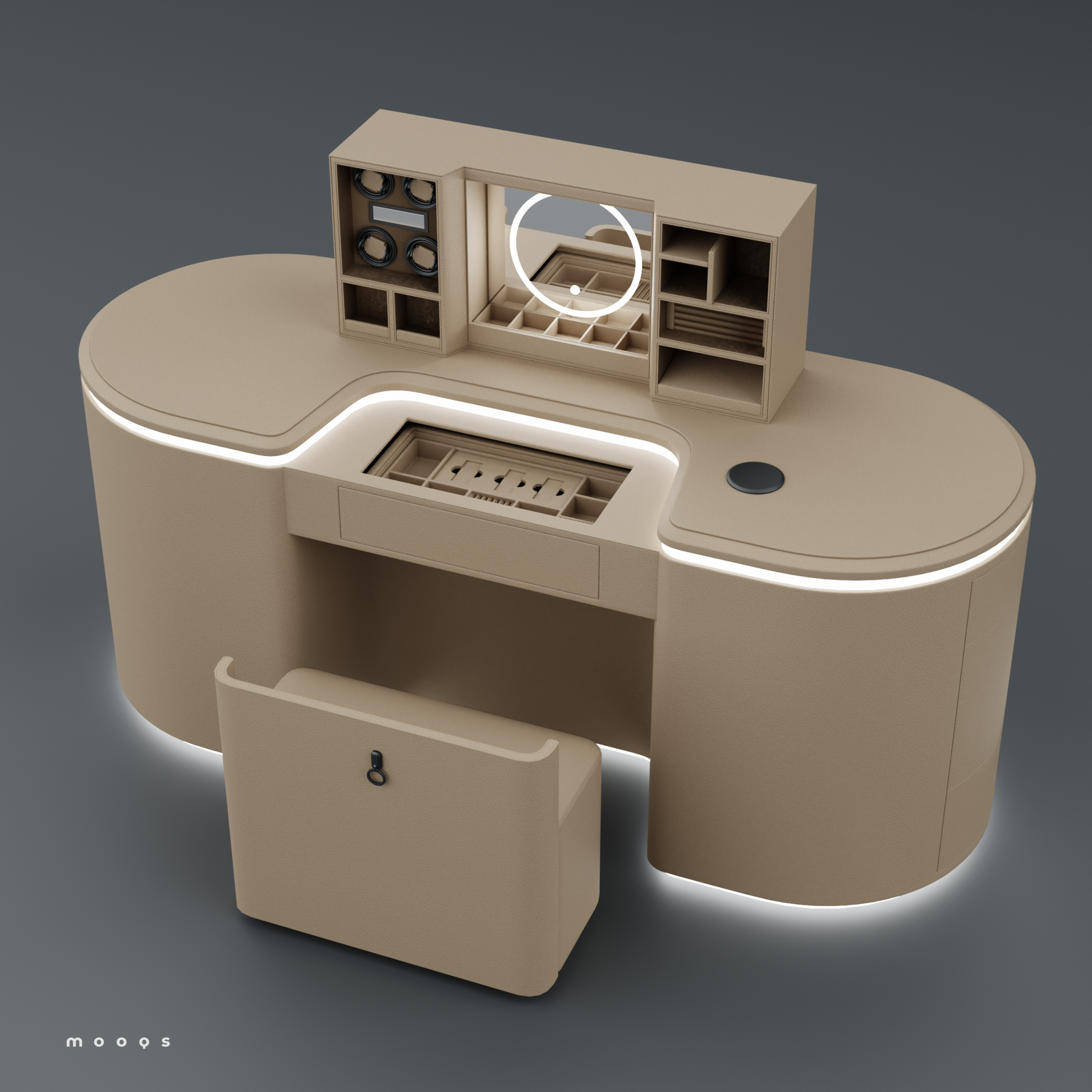 وتتميز الطاولة بتقنية متطورة تضيف لمسة من الحداثة والتميز، حيث يمكن بلمسة بصمة واحدة رفع جزء أنيق من سطح الطاولة ليظهر مرآة فاخرة وستة دوّارات مخصصة للساعات، إلى جانب مساحة مخفية وآمنة لحفظ المجوهرات الثمينة. تم تصميم هذا القسم الداخلي بعناية ليكون مثاليًا لتخزين الخواتم، والقلائد، والأساور، والساعات، مع الحفاظ عليها منظمة ومحمية.