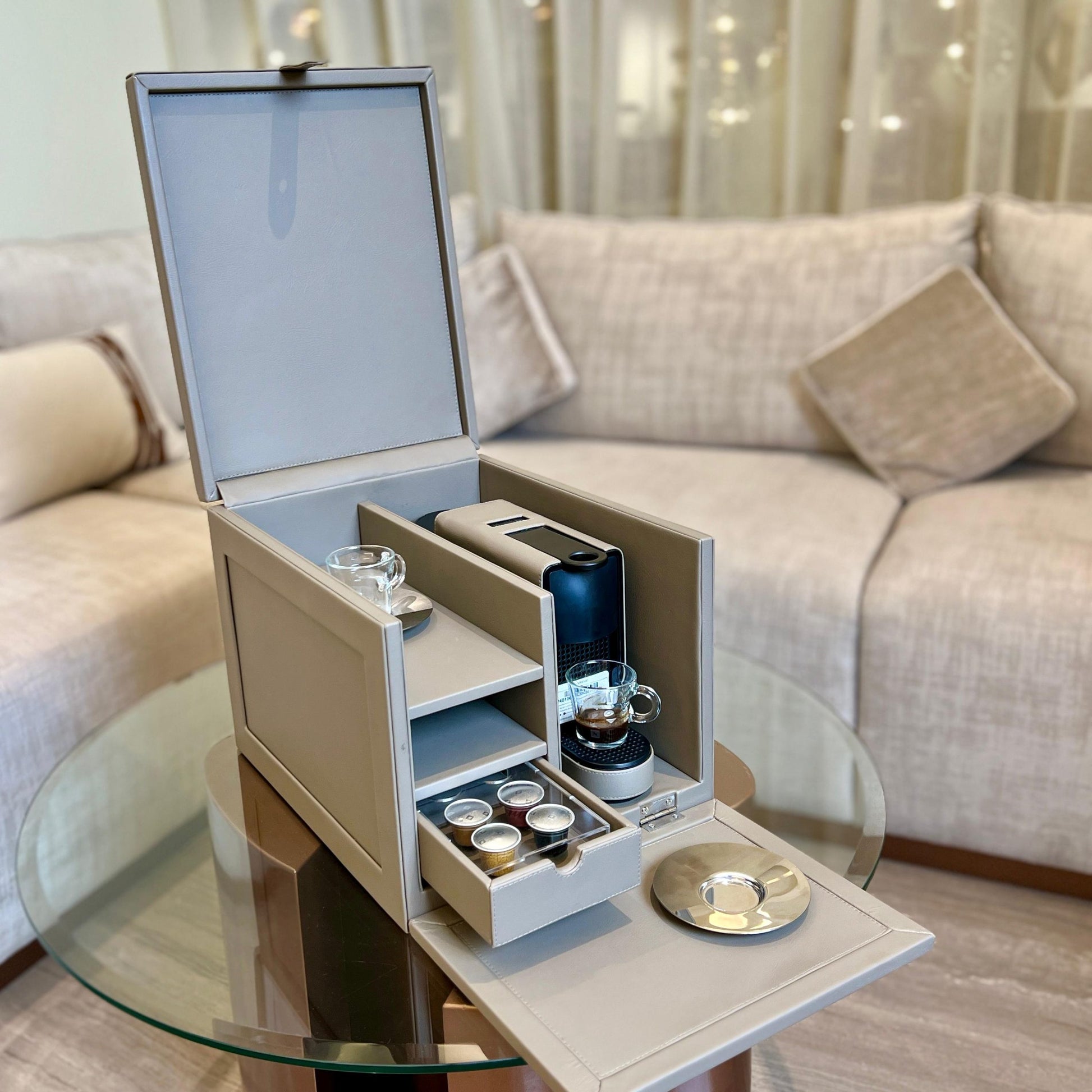 ماكينة إسبريسو في علبة جلدية - تتضمن كبسولات وكوبين زجاجيين أنيقين كهدية