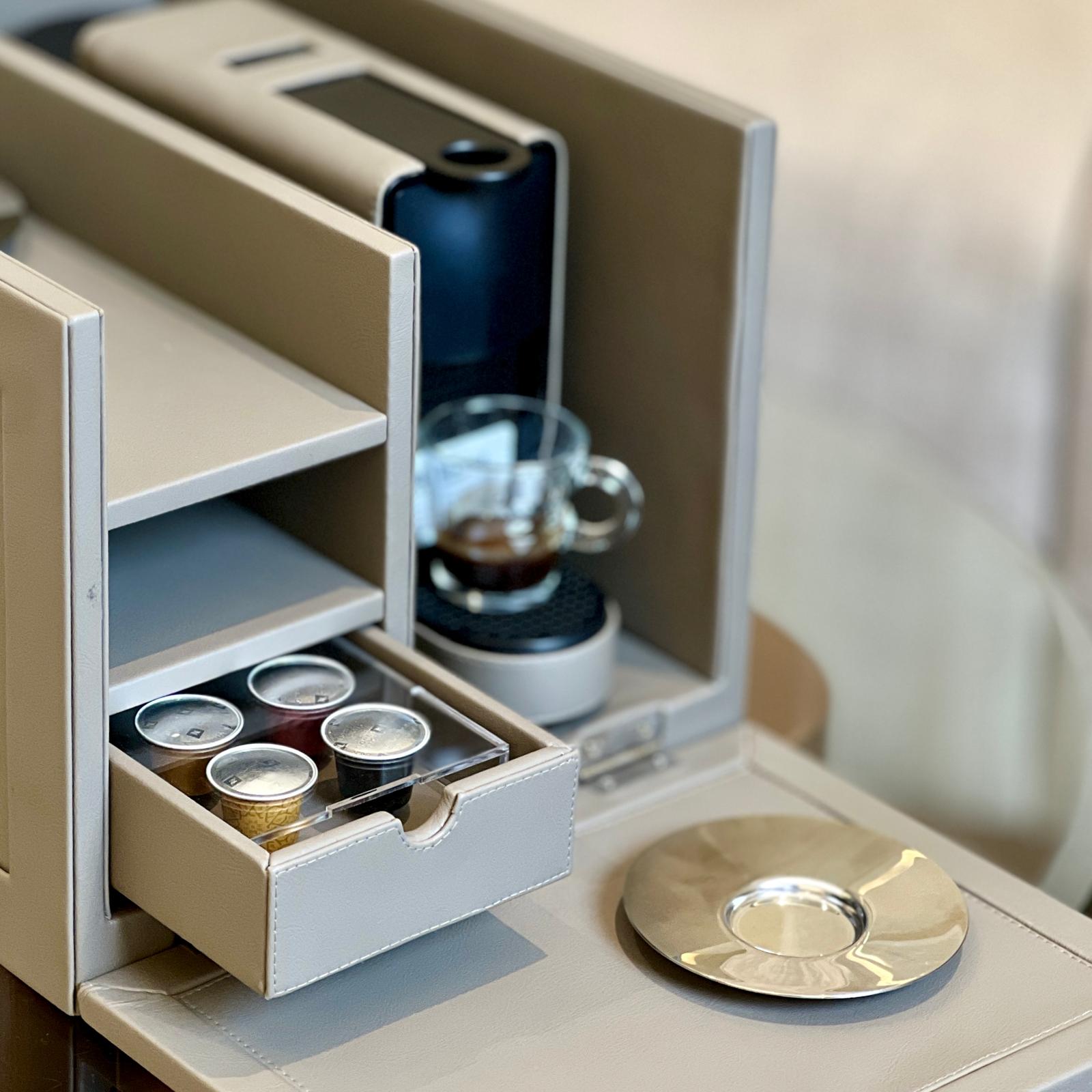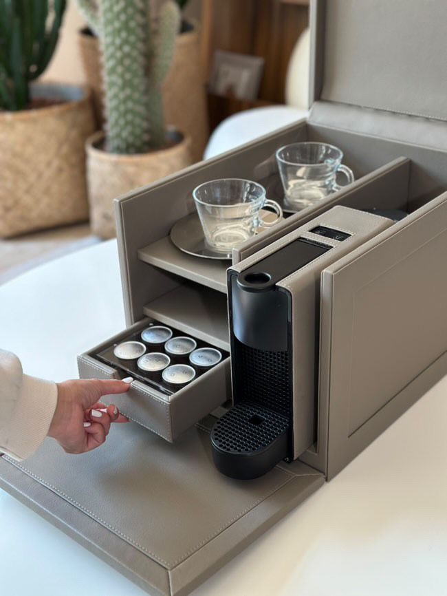 قم بترقية لحظات القهوة الخاصة بك مع آلة الإسبريسو الفاخرة ذات اللون البيج، والتي تم تعبئتها بشكل أنيق في علبة جلدية فاخرة - مثالية للاستخدام الشخصي أو كهدية راقية.