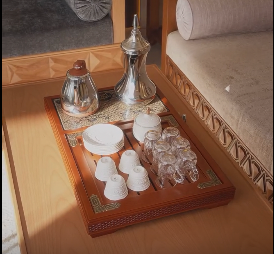 تُستخدم لتقديم القهوة أو الشاي العربي بأناقة وجمال مع أباريق الشاي والفناجين التقليدية، مما يضفي لمسة من الفخامة على أي تجمع.