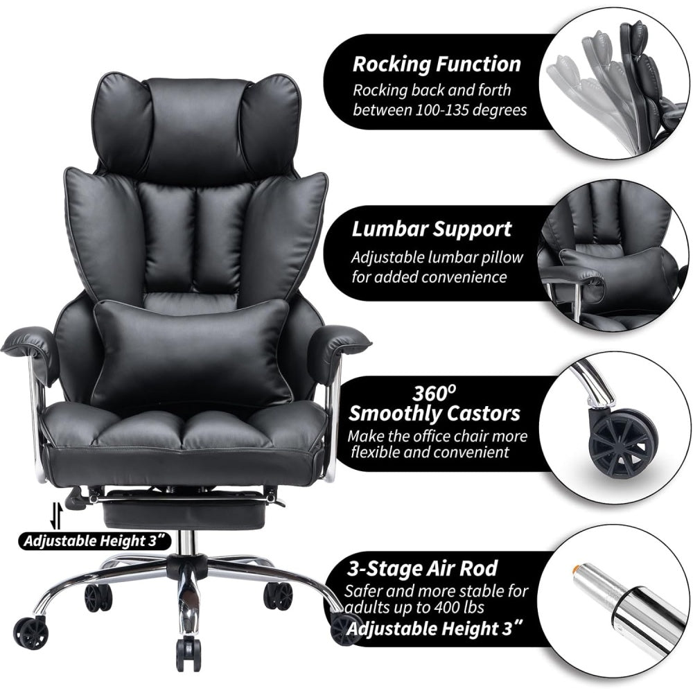 الكرسي مصنوع من جلد PU (جلد صناعي) ومتوفر باللون الأسود. يتحمل وزنًا أقصى يصل إلى 200 كجم، ويتميز بزوايا مسند ظهر قابلة للتعديل: 100°، 110°، و135°. تتضمن الميزات الإضافية مسند رأس قابل للتعديل، ووسادة دعم للفقرات القطنية، ومسند قدم قابل للتمديد، وثلاث وضعيات مريحة، وعجلات دوارة بزاوية 360 درجة، ونظام زنبركي غازي معتمد من SGS بثلاثة أوضاع قفل.