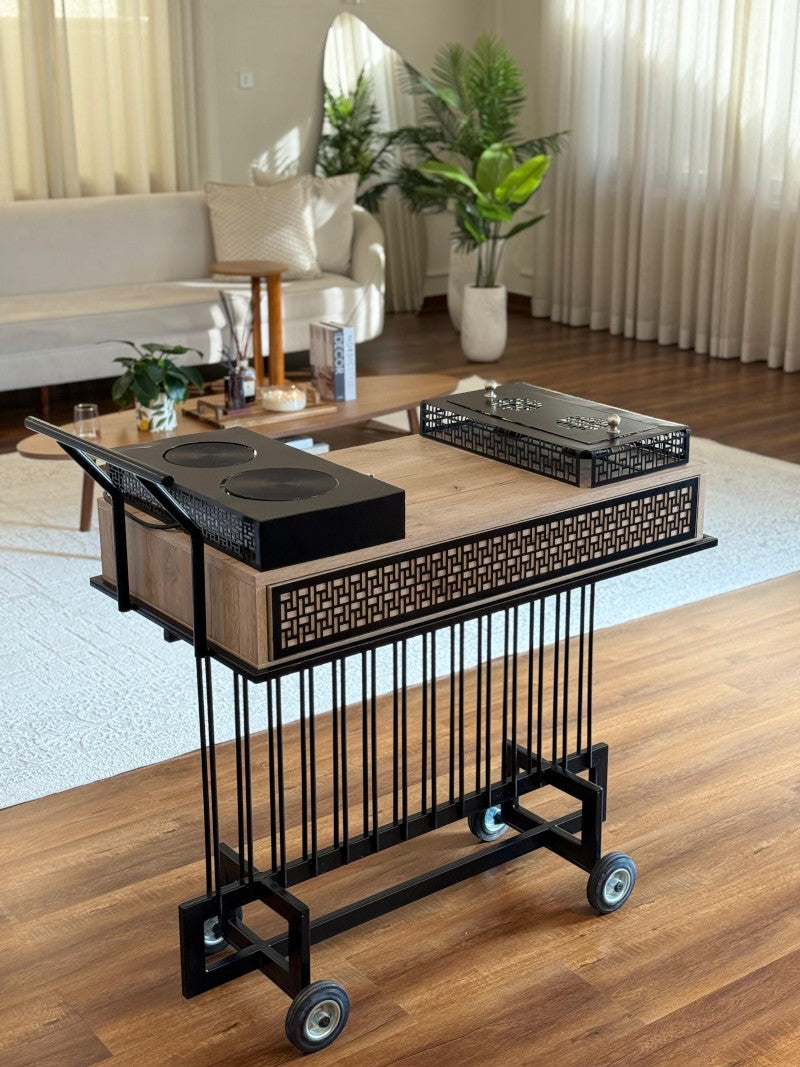 تتميز العربة بسخان شموع مقاوم للاشتعال، يساعد في الحفاظ على دفء المشروبات أو الطعام أثناء التقديم، مما يجعلها مثالية لتقديم الشاي أو القهوة أو غيرها من المشروبات الساخنة. كما تحتوي على درج سفلي مصمم بعناية مع فواصل أكريليك لتنظيم التخزين.